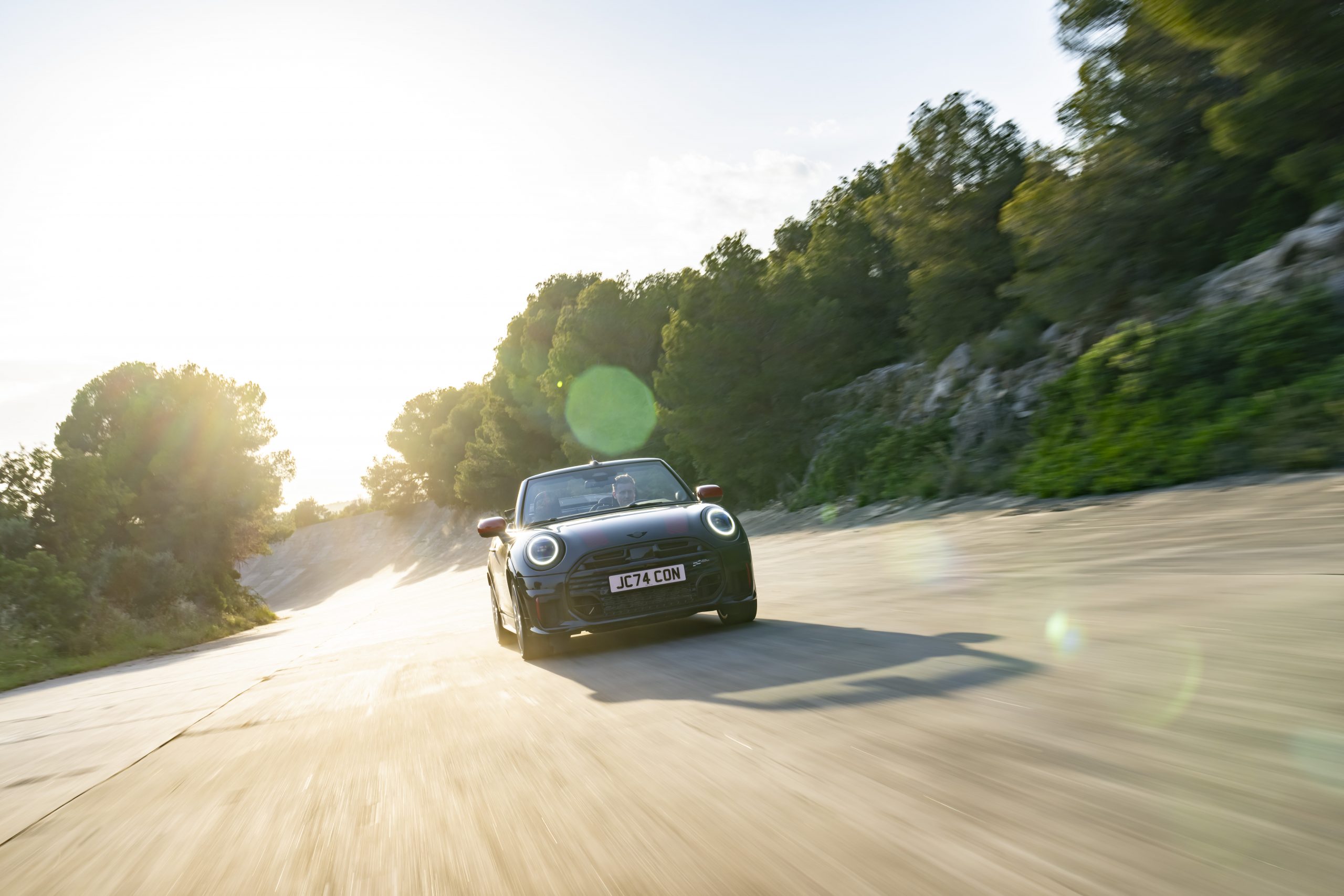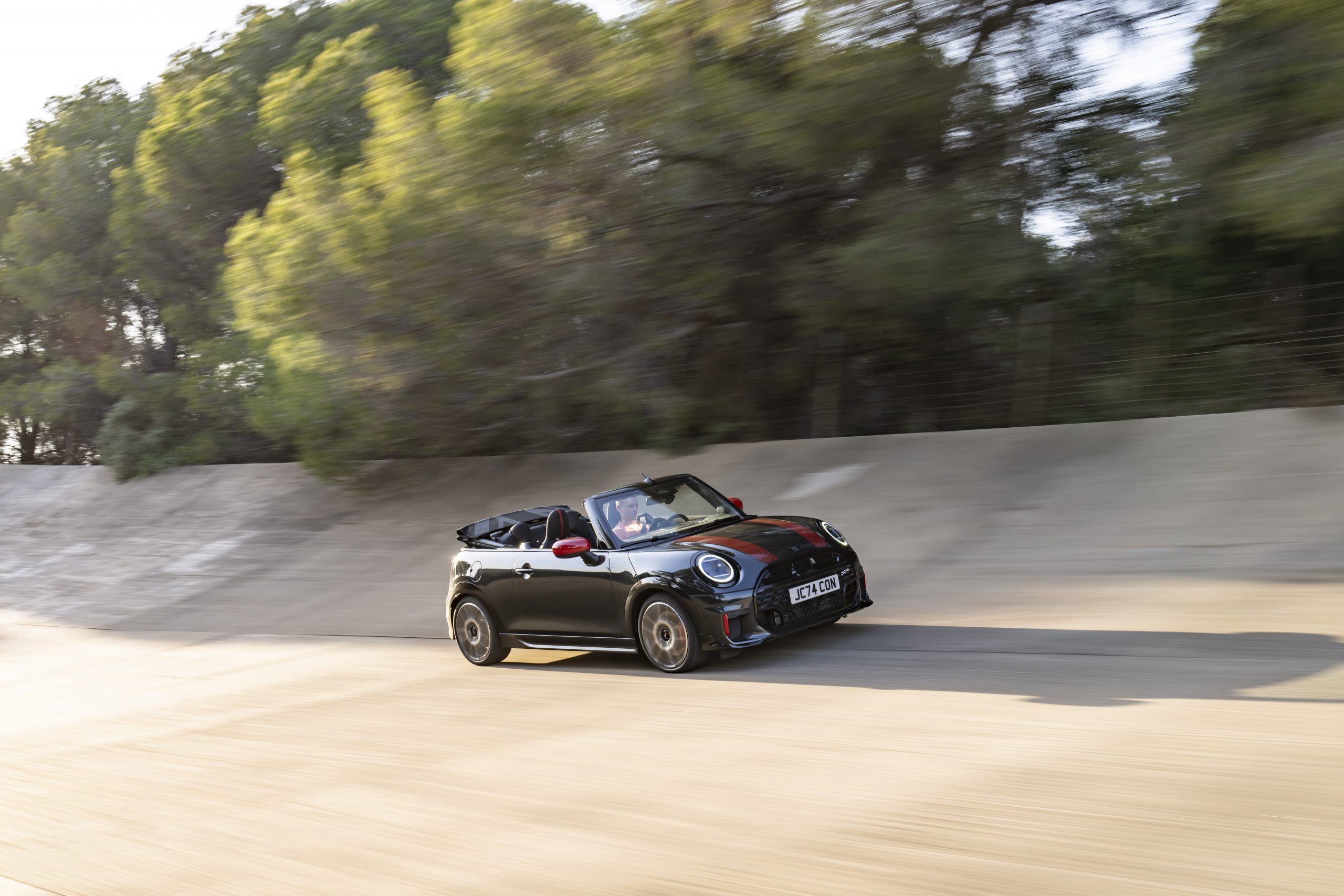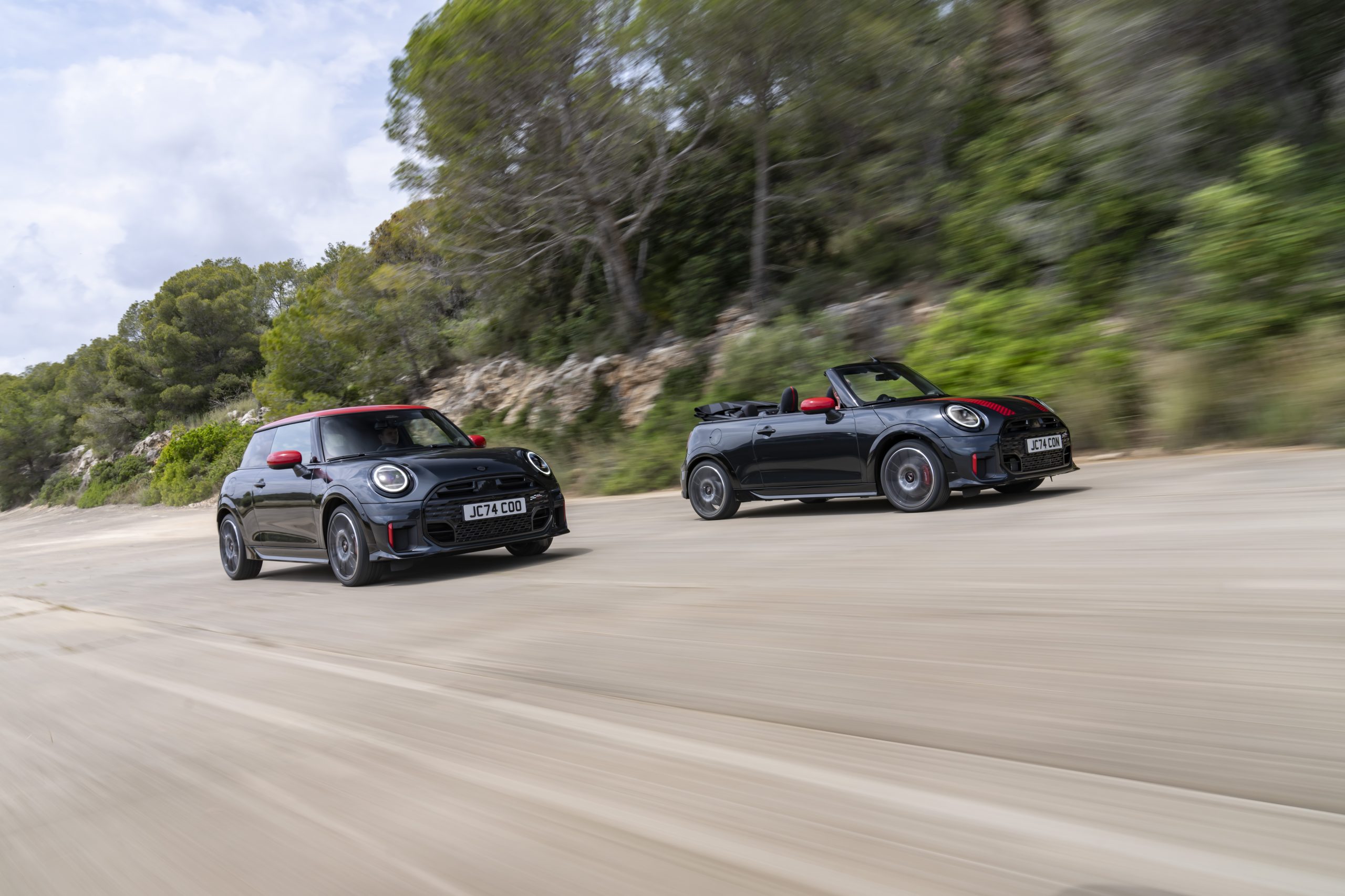 De MINI John Cooper Works sprint in 6,1 seconden van 0 naar 100 km/u, terwijl de cabrioversie dat in 6,4 seconden doet. Beide modellen halen topsnelheden van respectievelijk 250 km/u en 245 km/u. Het chassis, samen met de dubbele koppeling en schakelflippers, zorgt voor een snelle en dynamische rijervaring. De sportieve remmen in Chili Red dragen bij aan een nauwkeurige beheersing, zelfs bij intensief gebruik.