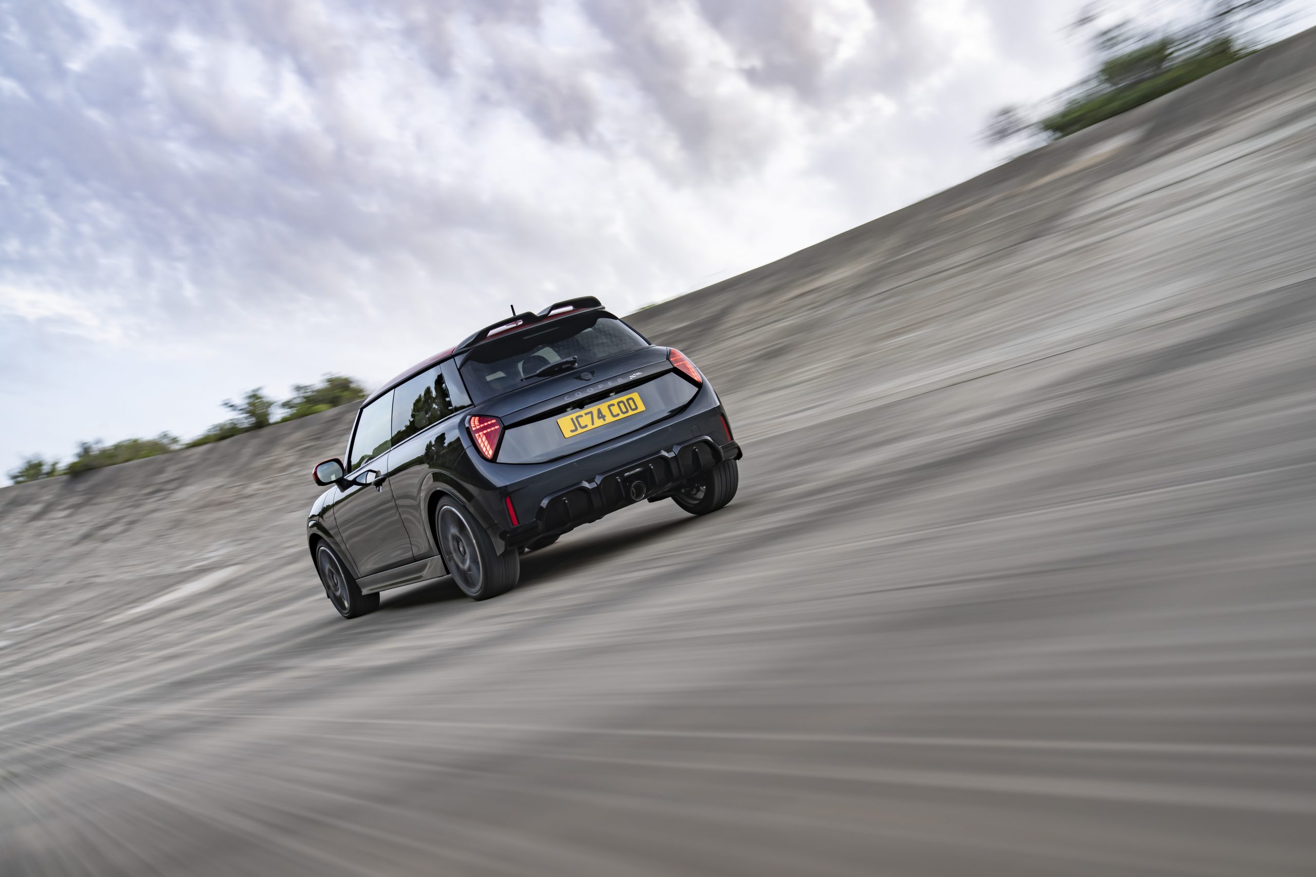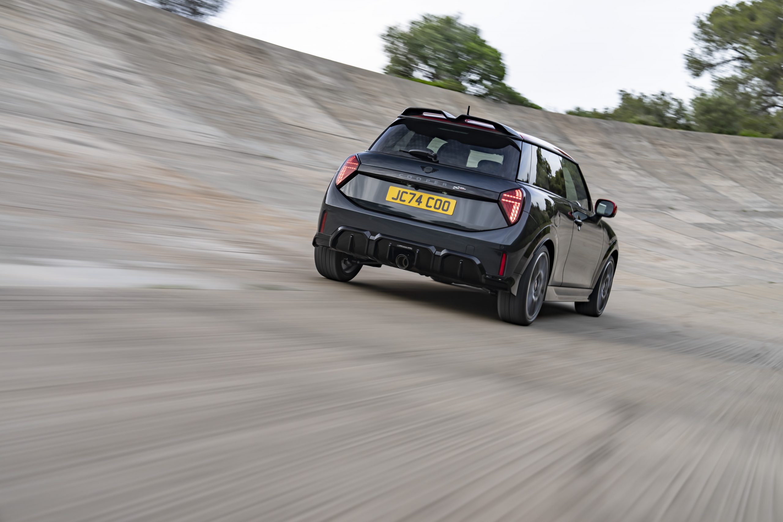 De voorkant van de nieuwe MINI John Cooper Works wordt gedomineerd door een achthoekige grille in hoogglans zwart, met extra luchtinlaten voor een optimale motorprestatie. Het achteraanzicht wordt gesierd door een aerodynamische spoiler en een centraal geplaatste uitlaat, wat bijdraagt aan de sportieve uitstraling.